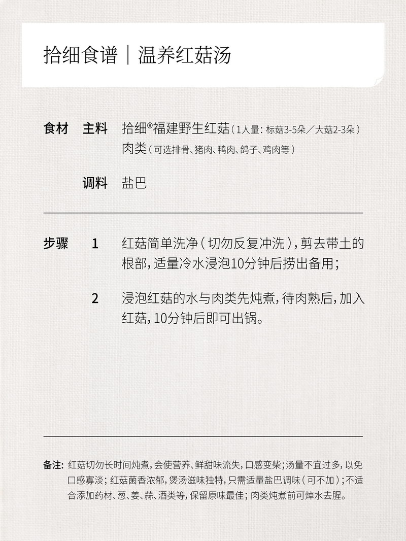 福建野生红菇菌香浓郁,煲汤滋味独特,只需“泡10分钟+煮10分钟”即可,切勿长时间炖煮,否则其营养与独有的鲜甜味都将流失,且口感也会变得难嚼如柴!下期我们再来分享如何挑选品优与分辨真假红菇哦,See you~