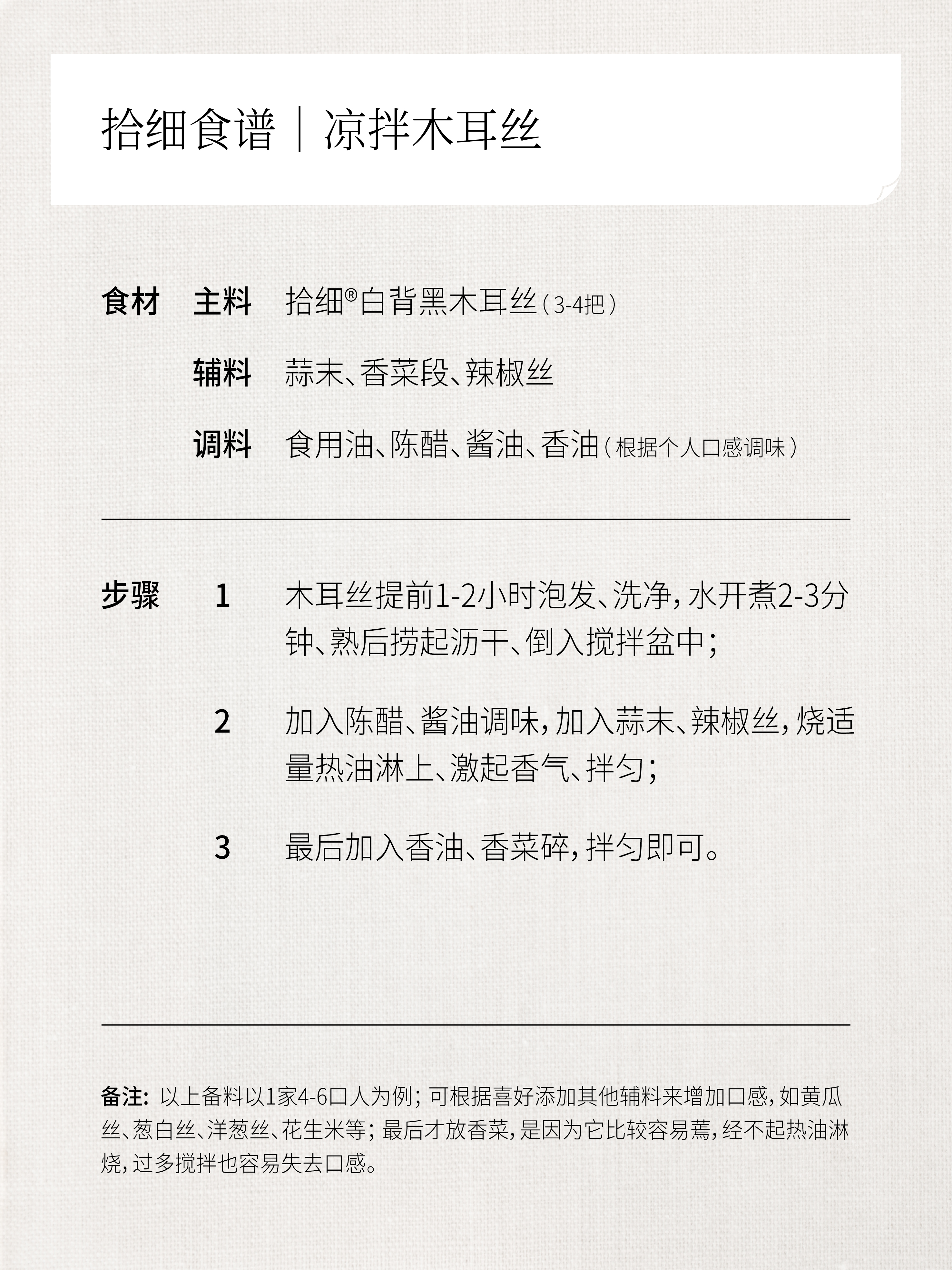 我们家的“白背黑木耳丝”是款百搭且美味的食材,即可做辅料也可当主角,选用肉质厚实的原料加工切丝,更易泡发也方便烹饪,满足了更为多样的烹调需求。